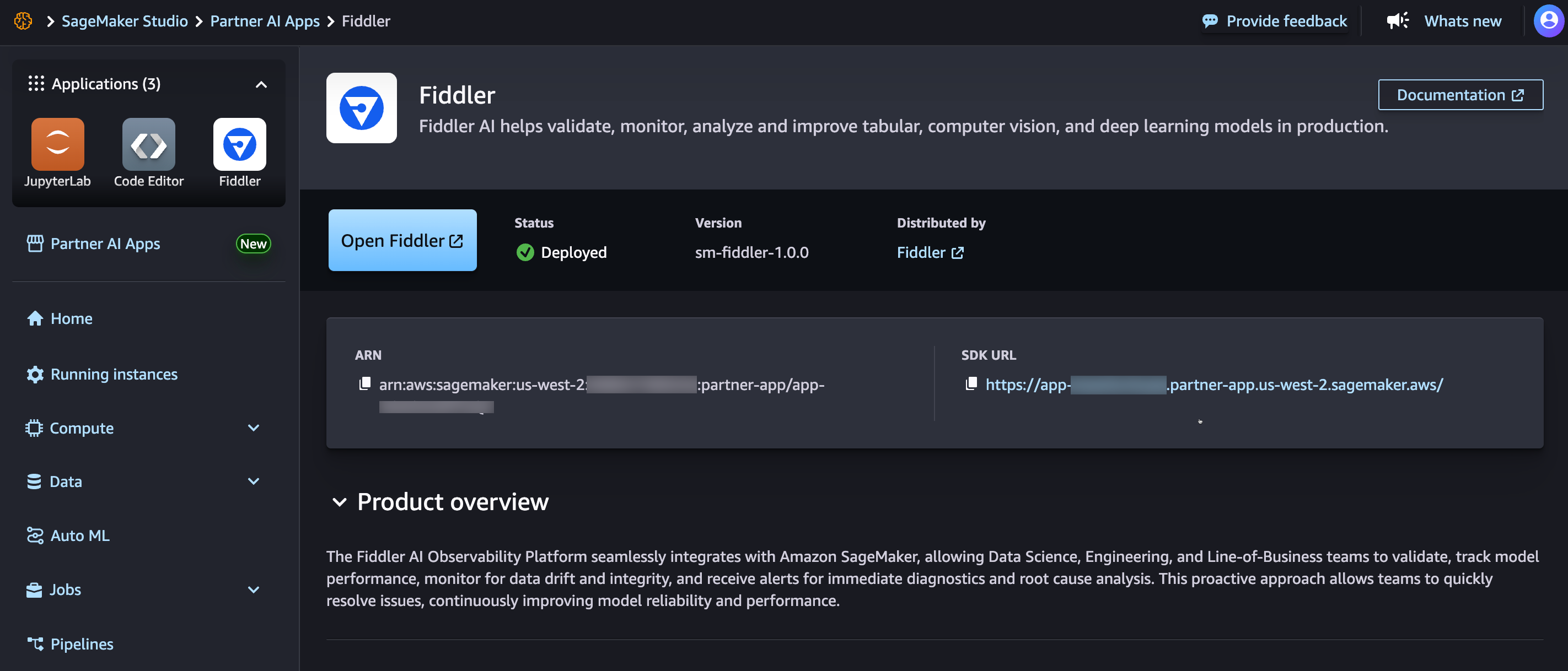 If you are using SageMaker Studio to access Fiddler, the SageMaker Partner App ARN and URL can be found by launching Studio and clicking on the Fiddler icon in the Applications list as show below: