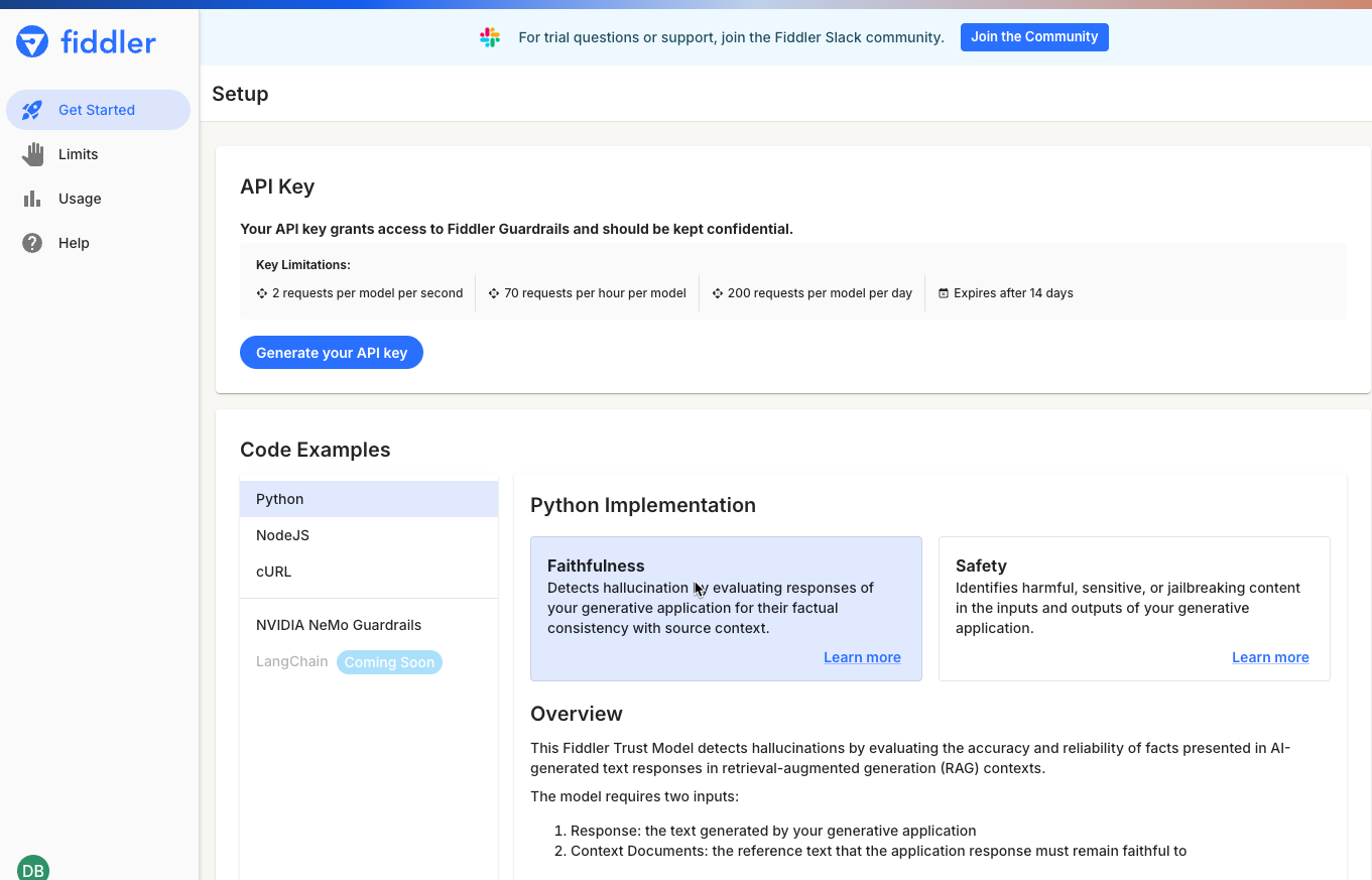 <figure><img src="https://3170638587-files.gitbook.io/~/files/v0/b/gitbook-x-prod.appspot.com/o/spaces%2F82RHcnYWV62fvrxMeeBB%2Fuploads%2Fgit-blob-78ad147da650bb7ae46055ff42afd3b3419be2c7%2Fguardrail-freetrial-landing-page%20(1).png?alt=media" alt=""><figcaption><p>Generate your API key for access to Fiddler Guardrails</p></figcaption></figure>