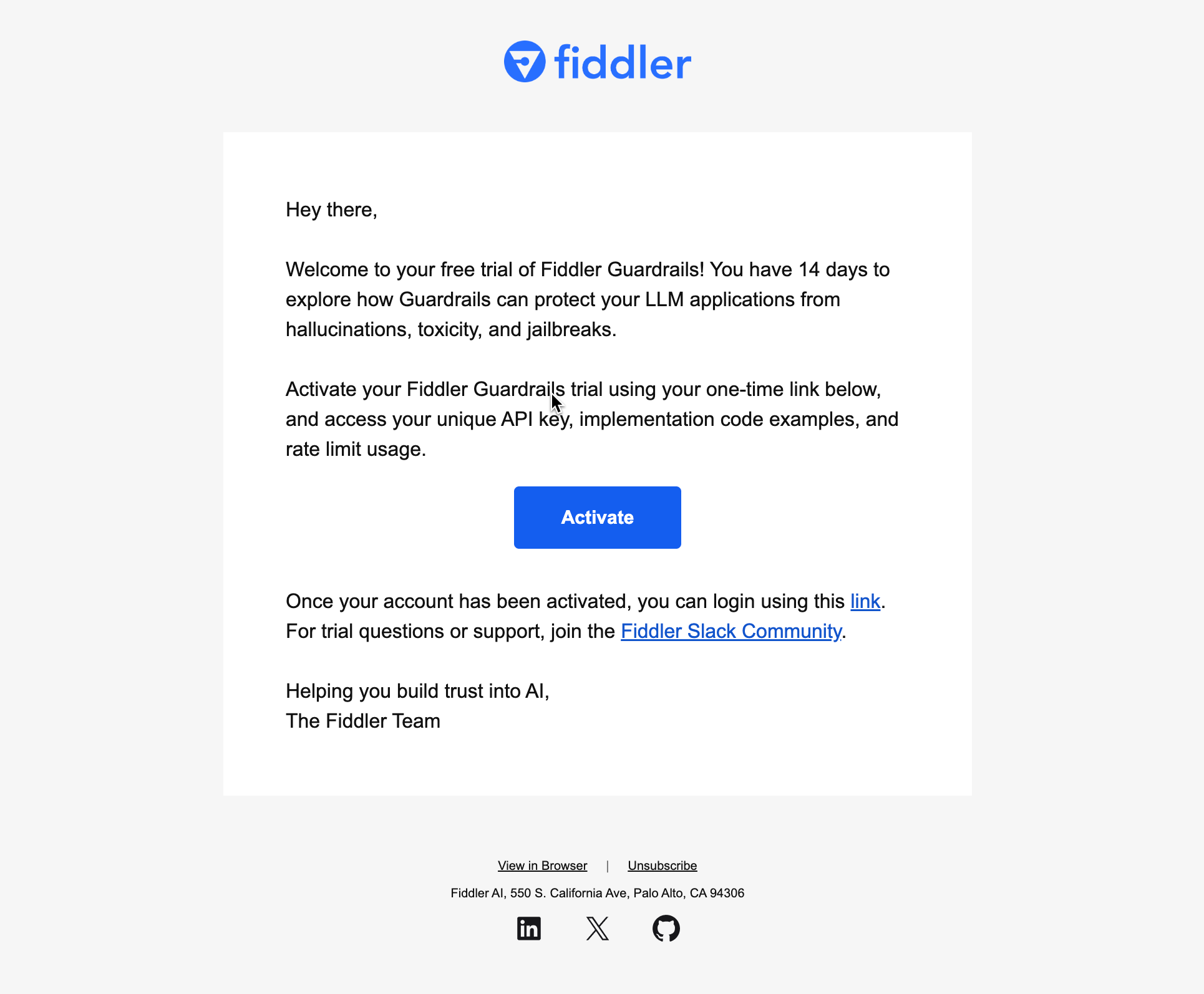 <figure><img src="https://3170638587-files.gitbook.io/~/files/v0/b/gitbook-x-prod.appspot.com/o/spaces%2F82RHcnYWV62fvrxMeeBB%2Fuploads%2Fgit-blob-e89a43fd6cdf1b1763070575bce0c88307b2ba68%2Fguardrail-freetrial-activation-email%20(1).png?alt=media" alt=""><figcaption><p>Fiddler Free Guardrails email confirmation</p></figcaption></figure>